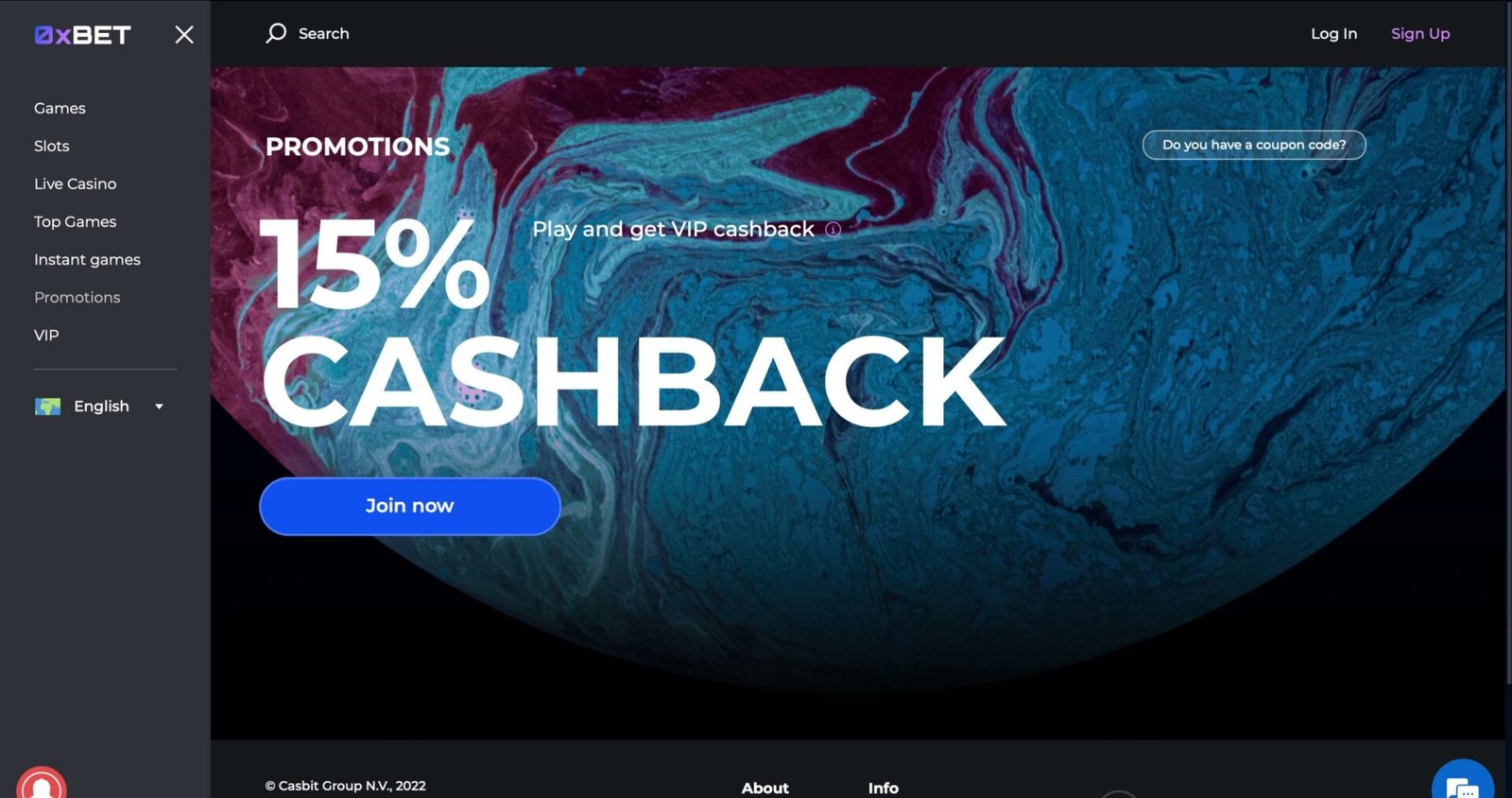 The welcome offer is 15% Cashback Bonus for all players of 0xbet casino!