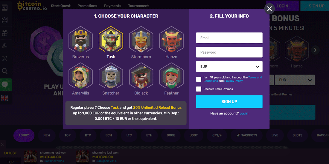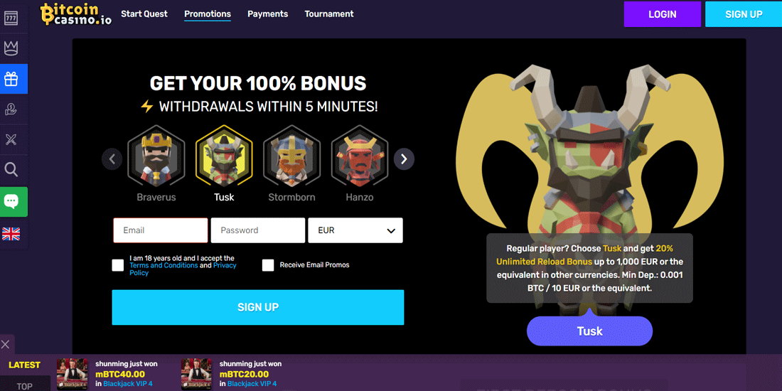 No bonus codes are needed to claim promotions and bonuses at BitcoinCasino.io. Just make a deposit and make sure to always read the bonus terms and conditions carefully!