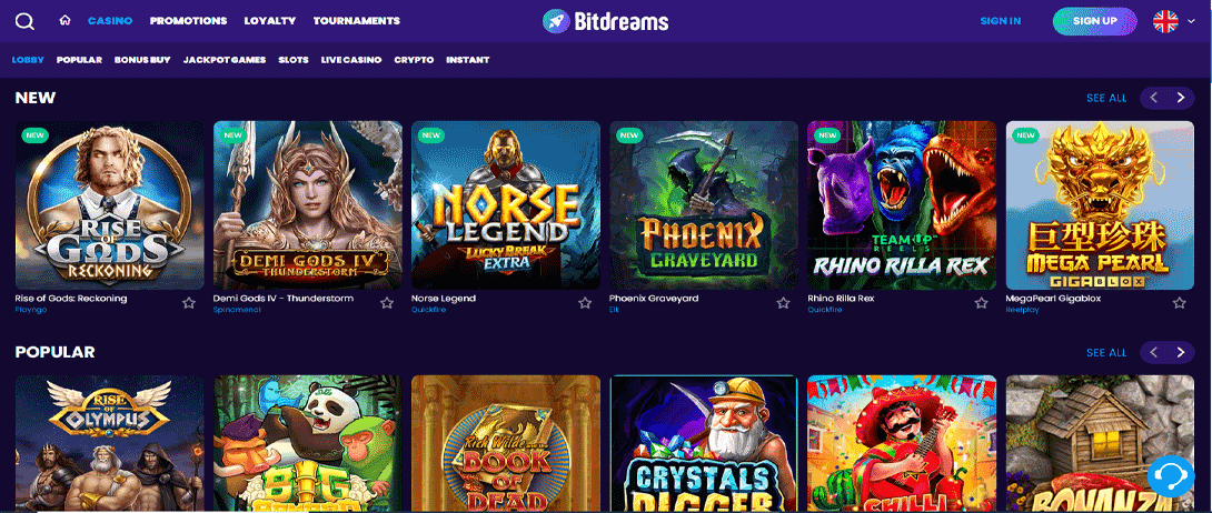 BitDreams Casino has an enriched casino engine of 7000+ casino games and live casino games. Players can pick from a vast selection of slots, instant games, lottery games, table games, and live dealer sessions with realistic live streams. The games supported have intriguing gameplay and smashing bonus features, and are developed by top providers, such as Big Bamboo, Rise of Olympus, Book of Dead, and Crystals Digger.