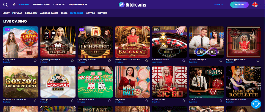 BitDreams Casino has one of the most realistic live dealer games. They work with top live games providers, like Evolution gaming, which streams in real-time from authentic casino studios all over the world with hundreds of live tables available. Including featuring live sessions of Lightning Blackjack, Infinite Blackjack, Casino Hold’em, Monopoly Live, Baccarat Super 6, Dragon Tiger, American Roulette, and so much more.