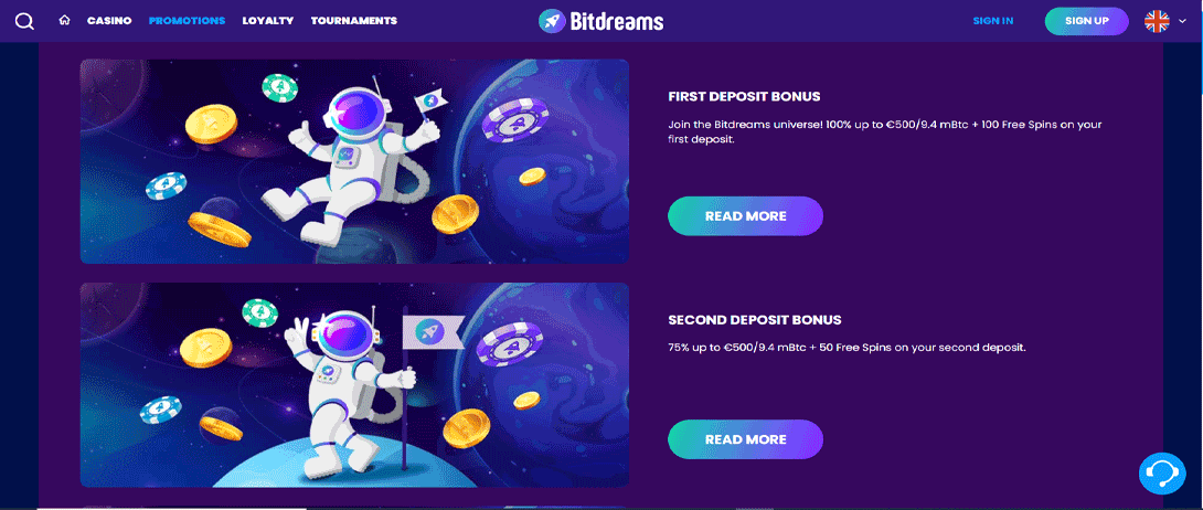 The VIP system of BitDreams Casino is rewarding and mega lucrative! It consists of a total of 10 VIP levels you can unlock, taking you on an exploration of new planets with new bonuses and special awards, Earth, Moon, Mars, Venus, Jupiter, Mercury, Saturn, Uranus, Neptune, and Bitopia. The more you play in the casino, the more Stars Points you will claim to increase your VIP status.