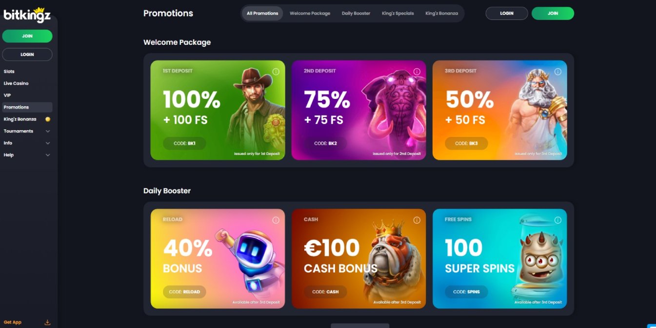 Players are not required to enter any bonus codes to benefit from the splendid bonuses and promotions on Bitkingz Casino’s behalf. You can receive them as soon as you complete your registration on the platform!