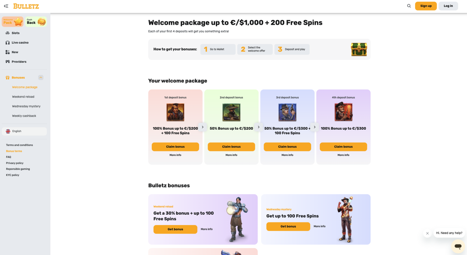 New players at Bulletz Casino are greeted with a substantial welcome package totaling up to €1,000 in bonus funds and 200 free spins, distributed over the first four deposits.
