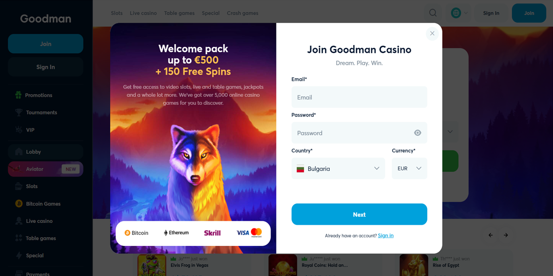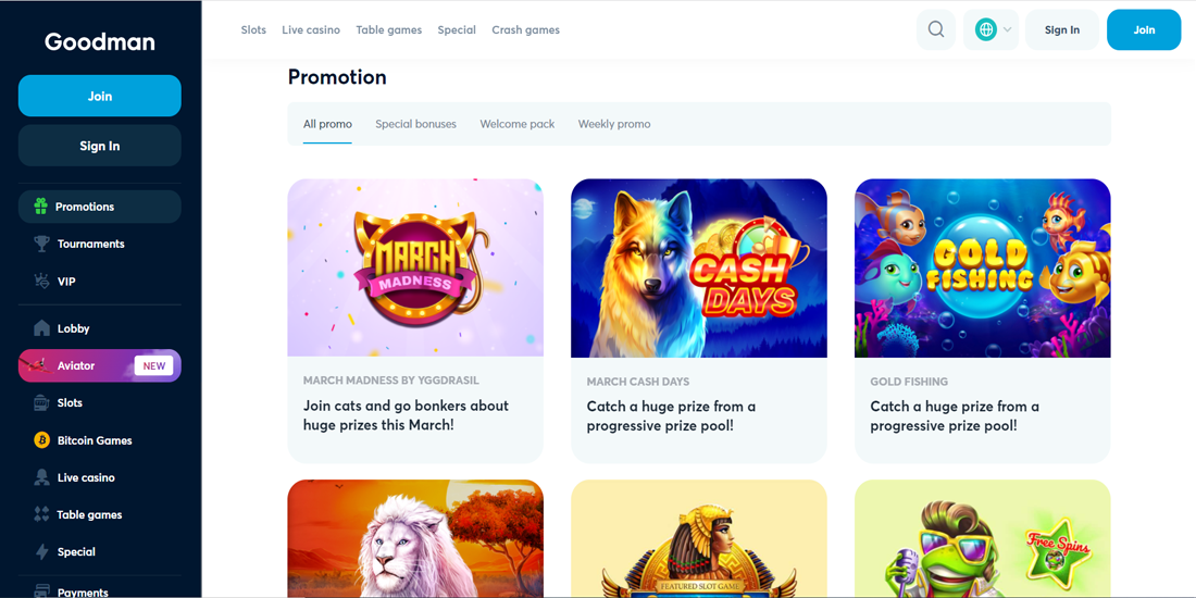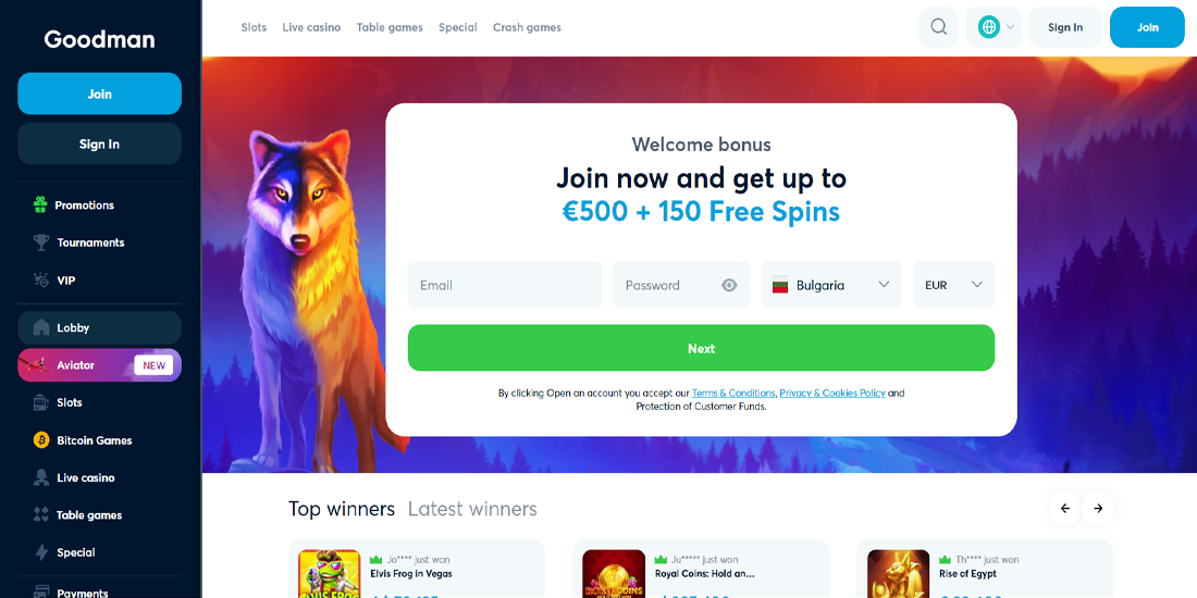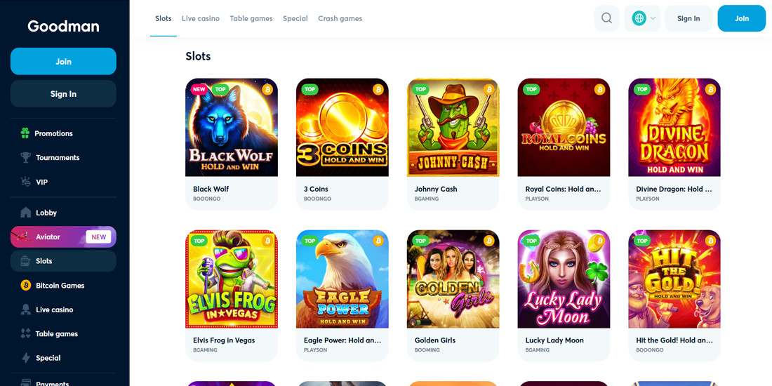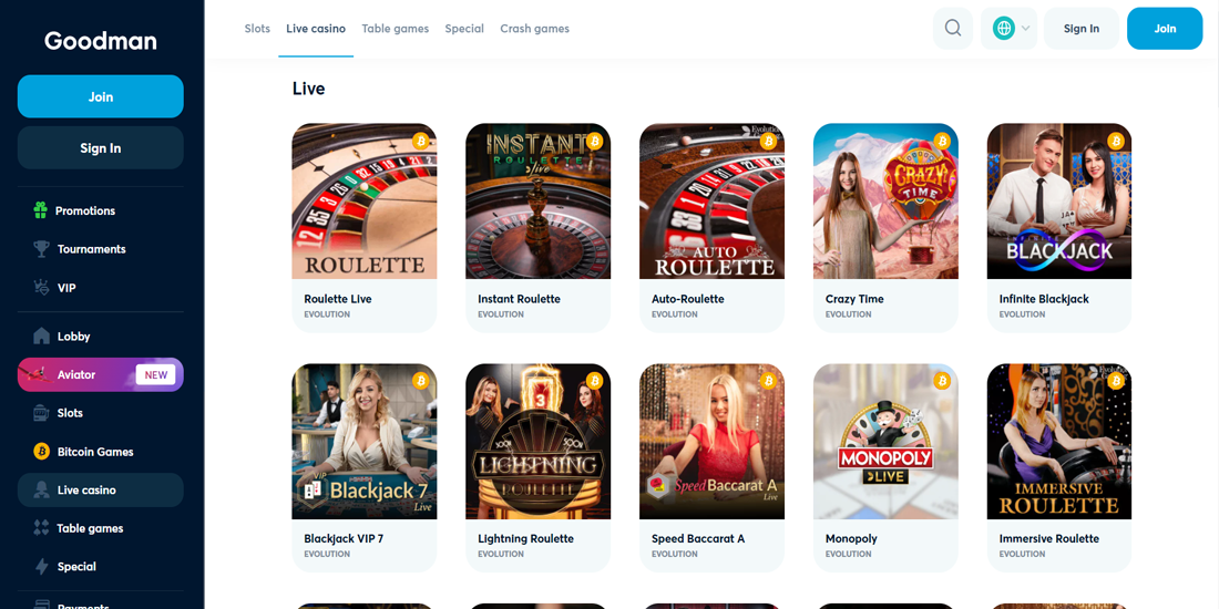 It also accepts payment methods in the most widely-used, national fiat currencies and the world’s top cryptocurrencies, including EUR, USD, PLN, BTC, USDT, LTC, and plenty more. Goodman stands out with a lucrative bonus system, featuring all kinds of weekly promotions, daily aviator free spins, competitive tournaments, and a large welcome package for newly registered gamblers!