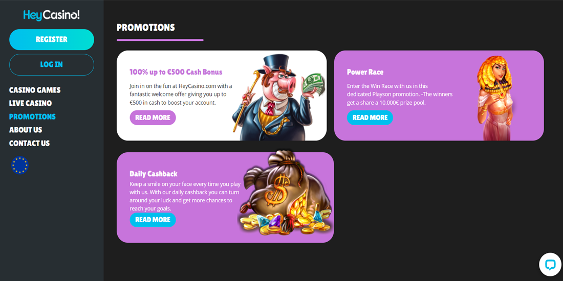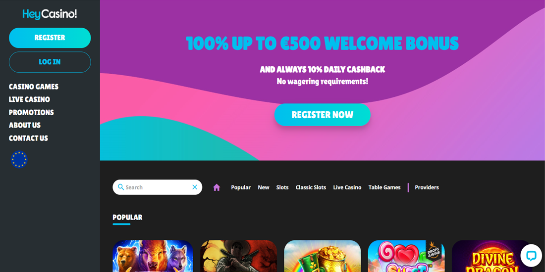 HeyCasino offers its newly registered players some amazing and generous bonuses! First and foremost is their 10% cashback bonus. Once you make your first deposit and start gambling, you are eligible to receive up to 25 EUR right back into your account! The best part? There are no wagering requirements to benefit from this bonus! Another excellent winning opportunity is presented in the form of the €2,500 Friday Cash Drop bonus which the casino gives away every Friday morning!