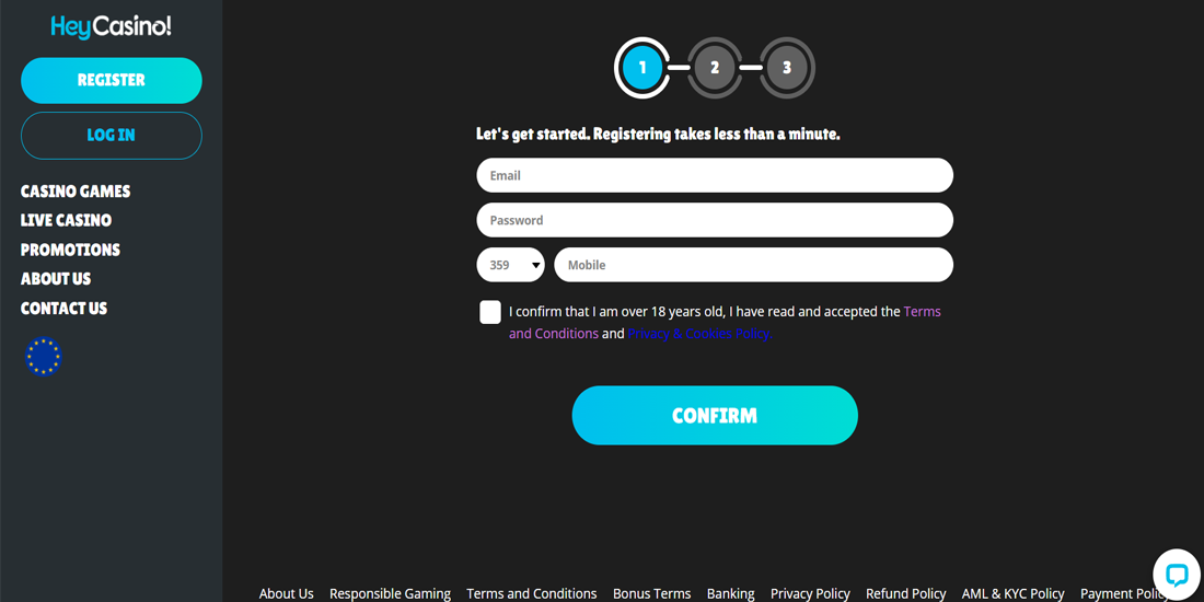 Registering a new player account on HeyCasino is the same as with any other online gambling venue. You will be required to submit your ID, Bank Statement, Address, phone number, etc, just your standard registration procedures. Then, this information is reviewed and your account will be activated within 3 working days. Upon making a withdrawal request, you may be charged by the casino, and the exact fee will be stated before the transaction is made.