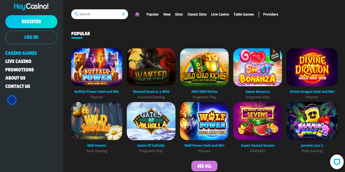 HeyCasino is among the newest projects of casino giants DMG Solutions B.V.. This online casino was first launched in 2020, and it has since then captivated the attention of many online gambling enthusiasts. Its catalog is home to more than 2500 unique and exciting slot games, along with 21 live casino games to suit every taste. Online gamblers will surely recognize the big names behind the developers who have hosted their games on this gambling platform, such as Evolution Gaming, Play’n GO, Pragmatic Play, and many more!