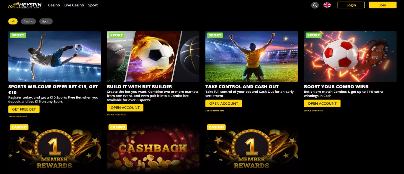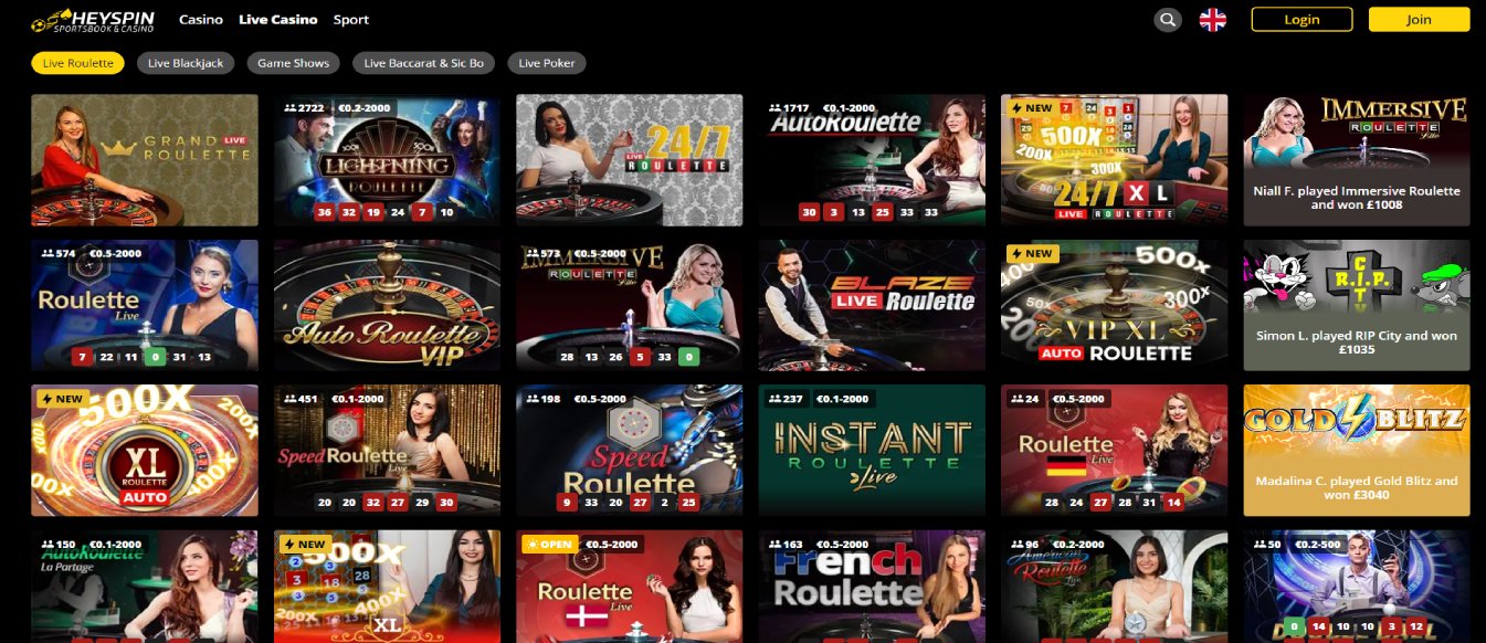 HeySpin has over 2160 casino games, including fine slot machines, immersive table games, card games, instant win games, and live dealer games. It also has a special live sports betting area.