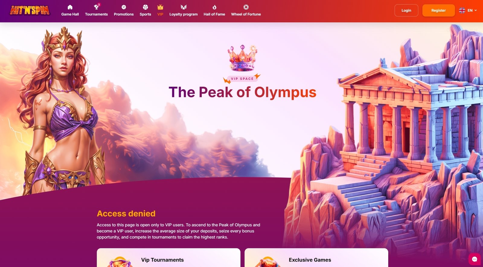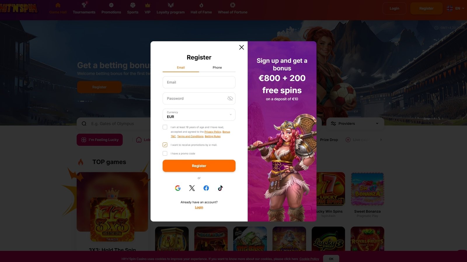 Hit N Spin Casino’s website layout is designed to provide users with an intuitive and engaging gaming experience. The homepage features a dark-themed interface accented with vibrant colors, creating a visually appealing contrast that highlights key sections and promotions. A prominent navigation bar at the top grants easy access to various areas, including the Game Hall, Tournaments, Promotions, Sports, VIP, Loyalty Program, Hall of Fame, and the Wheel of Fortune. This structured approach ensures that players can effortlessly find and explore the casino’s offerings.