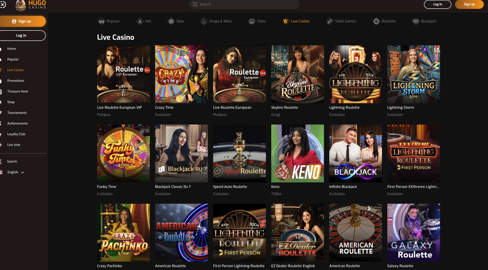 Hugo Casino collaborates with top-tier providers such as Evolution Gaming, Pragmatic Play, and Ezugi to deliver a wide array of live dealer games. Players can engage in classics like Blackjack, Roulette, and Baccarat, as well as explore unique offerings such as Lightning Roulette, Speed Blackjack, and Free Bet Blackjack. The live games are streamed in high definition from professional studios, ensuring a seamless and authentic gaming experience.
