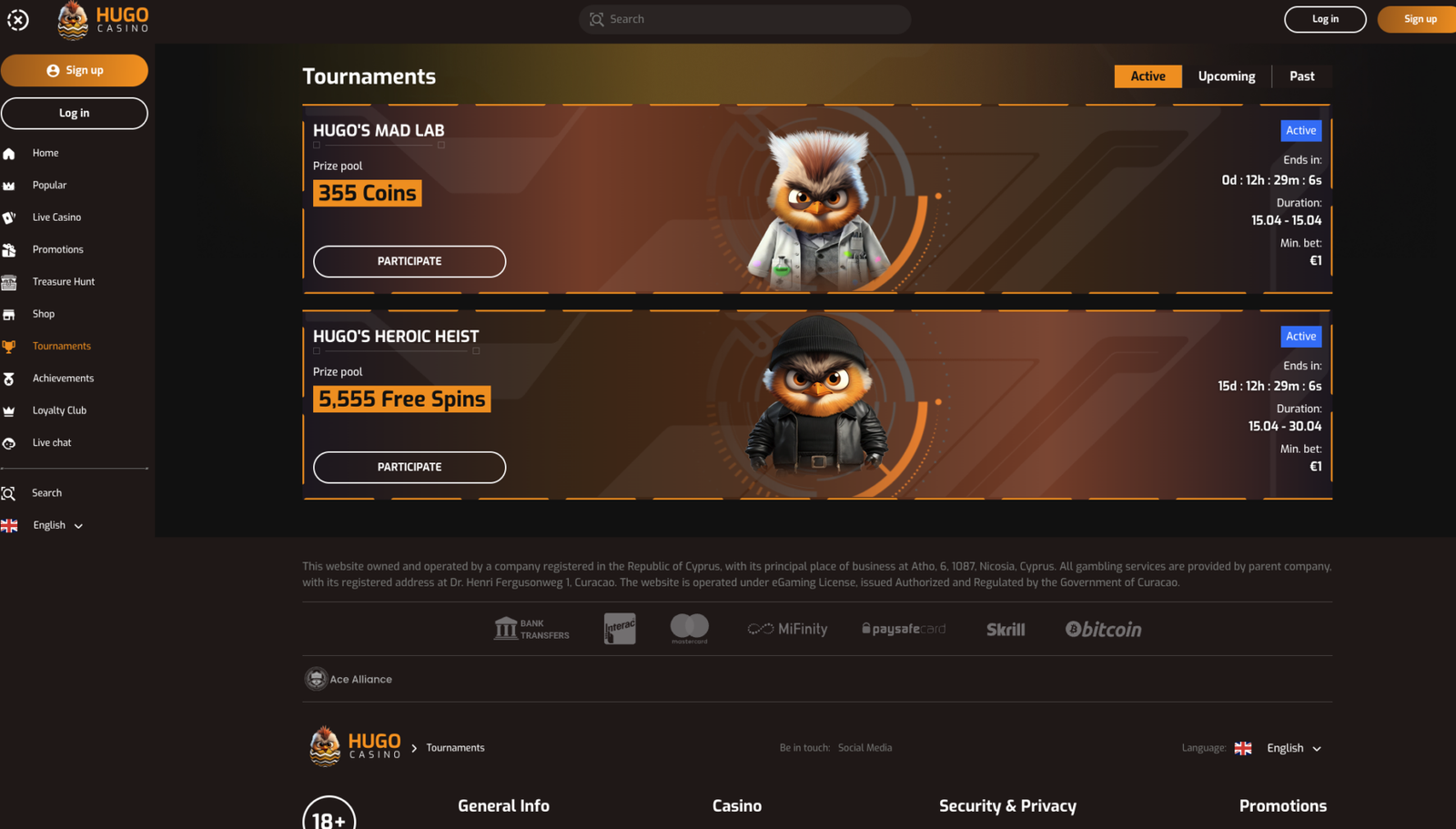 Yes, Hugo Casino hosts frequent tournaments and ongoing promotions, including Drops & Wins and seasonal prize pools.