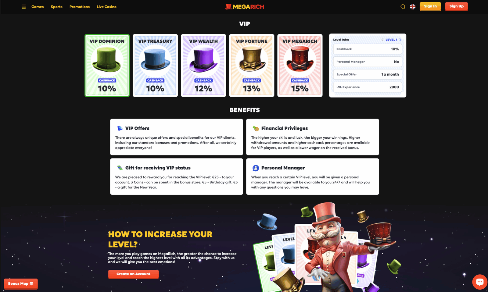 New players at MegaRich Casino are welcomed with a generous multi-tiered bonus package. You can claim up to €2,000 and 250 free spins across your first three deposits. Each bonus has a wagering requirement of around 30x, and spins are typically tied to featured slots. The promotion structure is clear, and bonus terms are transparently displayed. It’s one of the more rewarding welcome offers on the market.