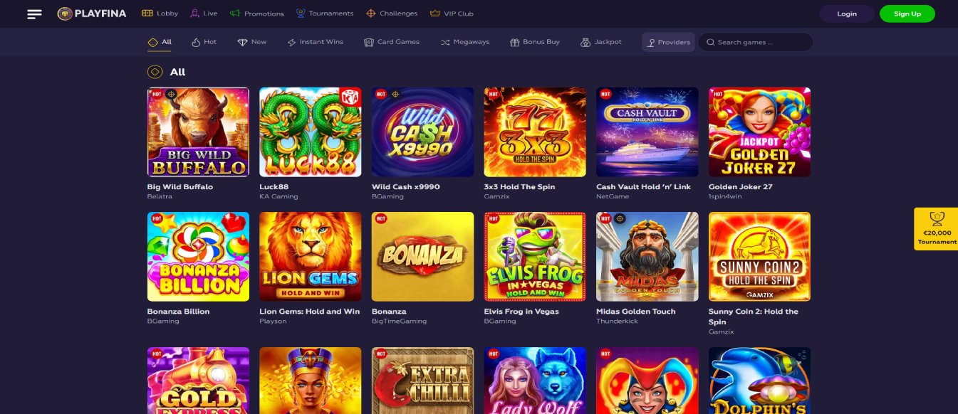 Playfina Casino has a diverse collection of games, including classic and modern slots, table games, live dealer games, and progressive jackpot games. There are over 8000 games to choose from.