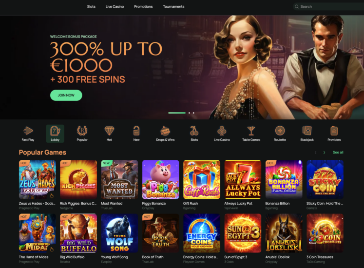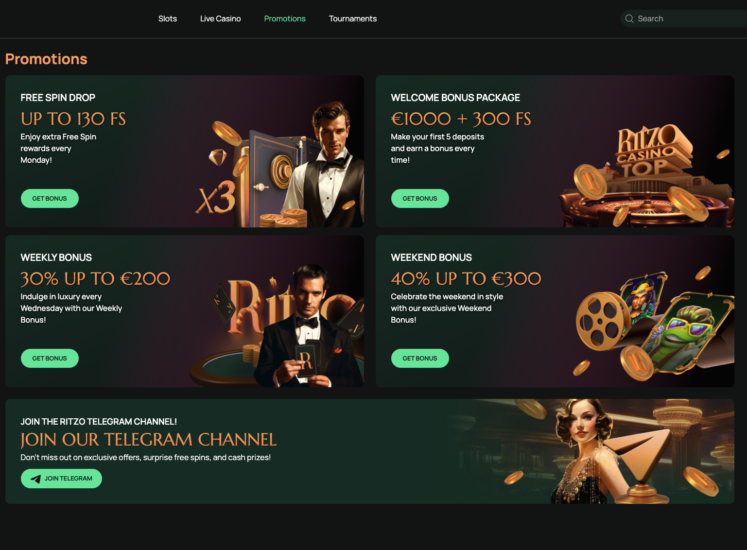 Ritzo Casino extends a comprehensive Welcome Bonus Package to new players, offering a total of 300% up to €1,000 plus 300 Free Spins, distributed over the first five deposits.