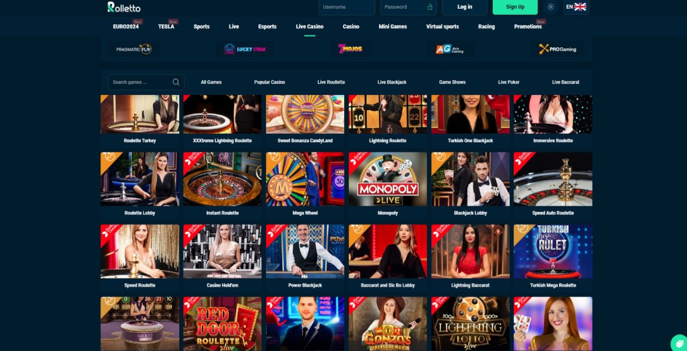 Many players nowadays prefer live games because of their highly realistic gameplay, and that is precisely where the most incredible live casino collection comes in, available only at Rolletto Casino. Entering the live casino lobby of Rolletto, you will be impressed by the multiple live game developers listed, including major brands like Evolution Gaming, LuckyStreak, Pragmatic Play Live, BetGames, 7Mojos, Ezugi, Asia Gaming, and XProGaming.