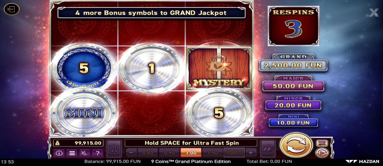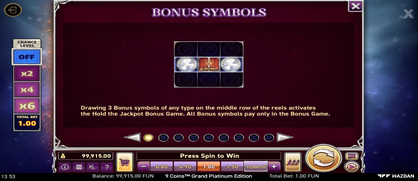 Discover the value of each symbol by referring to the paytable within the 9 Coins™ Grand Platinum Edition slot. This slot does not include regular symbols in the base game, but rather showcases bonus symbols such as Cash Infinity™, Cash out, and mystery symbols.