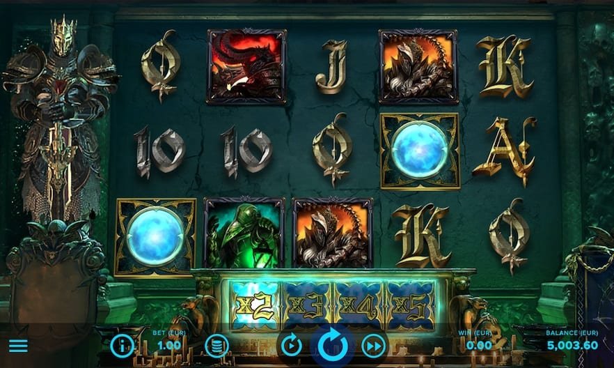 Even though Dark King: Forbidden Riches Slot doesn’t have a bonus game, it comes with plenty of features in the base game. The blue orb symbol acts as a substitute for all symbols except the scatter. The scatter itself can trigger the free spins feature and reward players as follows: 3 scatters bring 10 free spins, 4 scatters bring 12 free spins and 5 scatters bring 15 free spins. There is also another cool feature presenting Sticky wild hotspots which is a fixed area in the shape of a cross with 5 spots on reels 2, 3, and 4. Every wild symbol that lands in this cross turn into a sticky wild which can win you another free spin.