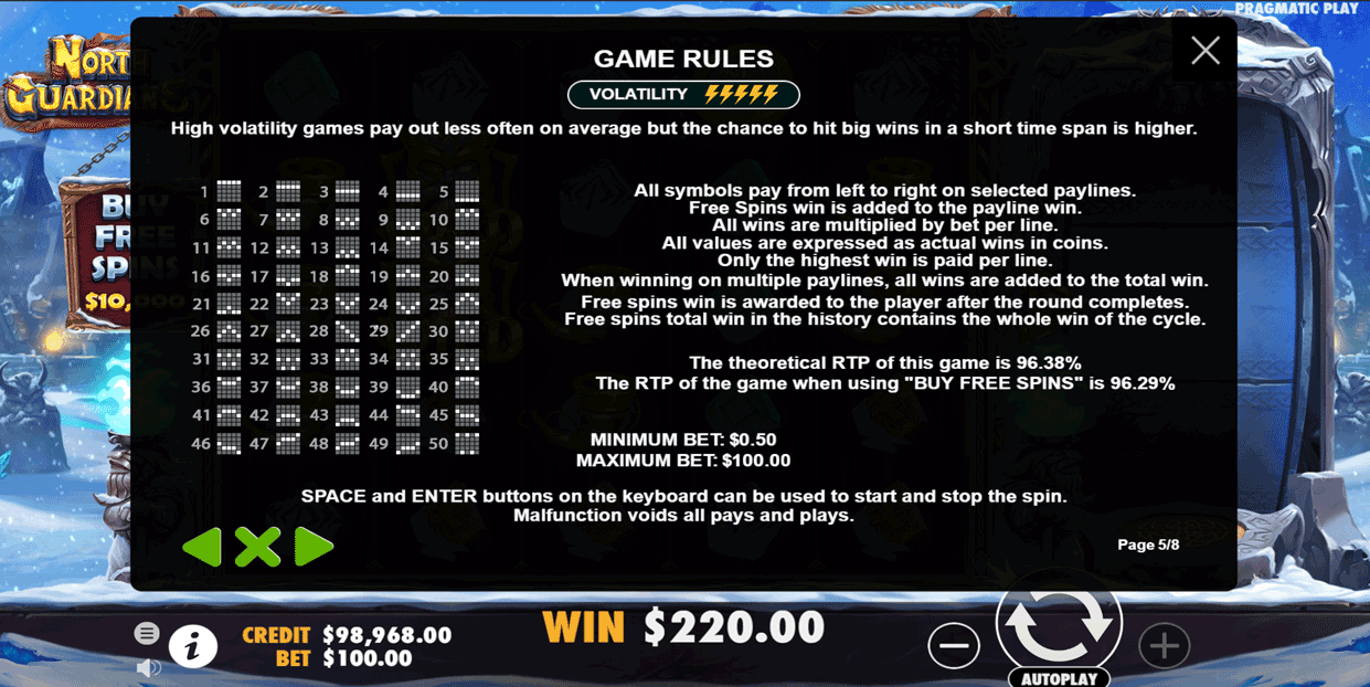 North Guardians is ranked as a 5/5 volatility game on Pragmatic Play’s own scale. This means that wins will be bigger than average, but less frequent as well. High volatility games are best for Highrollers looking to place huge bets, however, the game can also be enjoyed by more casual players as well.