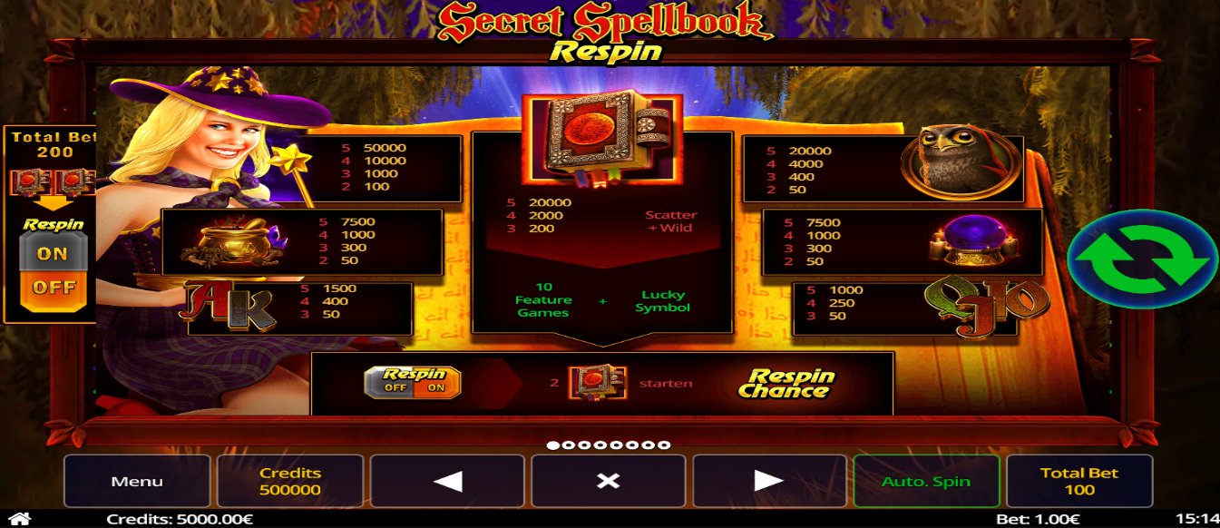 In Secret Spellbook Respin, you will explore the witches special book with secret spells and uncover unique respins and bonus features.