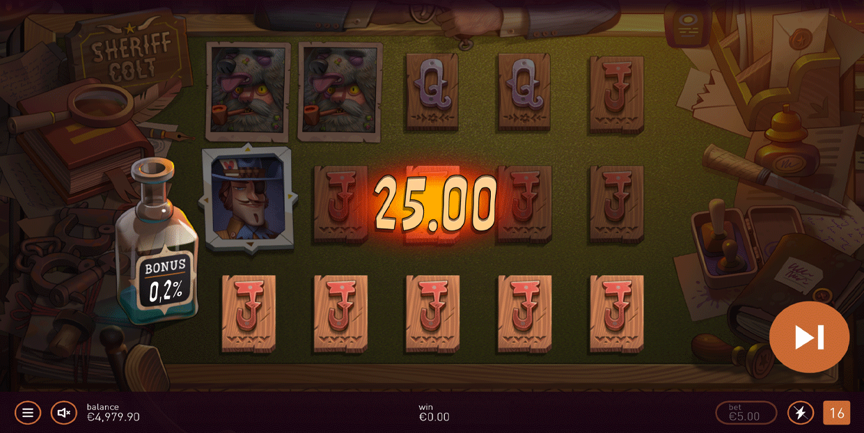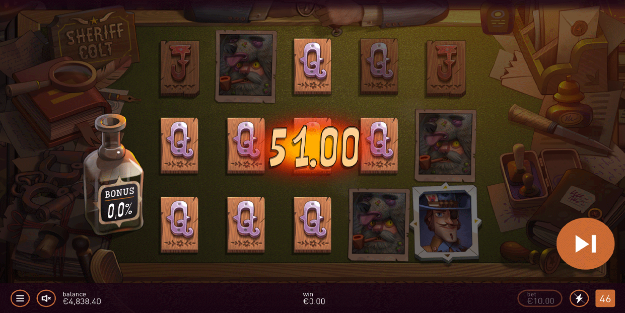 The Sheriff Colt slot is described as a medium volatility slot. Which combines the best of low and high volatility slots. You get frequent payouts that are satisfying in size. All in all, we would encourage you to give the Sheriff Colt slot a few spins. This video slot promises enticing rewards up to x10,000 on your bet, plenty of free spins, and seamless gameplay. Peter and Sons did not cease to amaze us again with an exceptional product.
