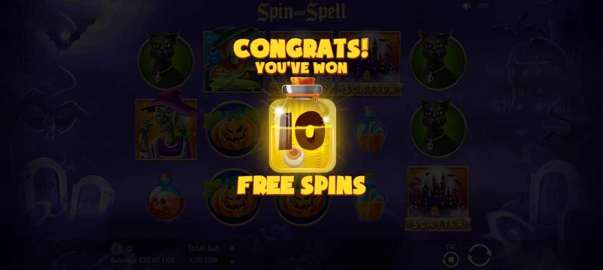 Wins on Spin and Spell slot are formed by landing 3 or more of a kind symbols on an active payline. This creates a winning combination that pays out a sum according to the paytable. Wilds are extra symbols that act as substitutes to every other standard symbol, helping you trigger wins even easier. Wilds are also the highest-paying symbols from the paytable. However, triggering the Free Spins feature is the most rewarding. So look out for those Scatters! You need 3 of them to receive 10 FS.