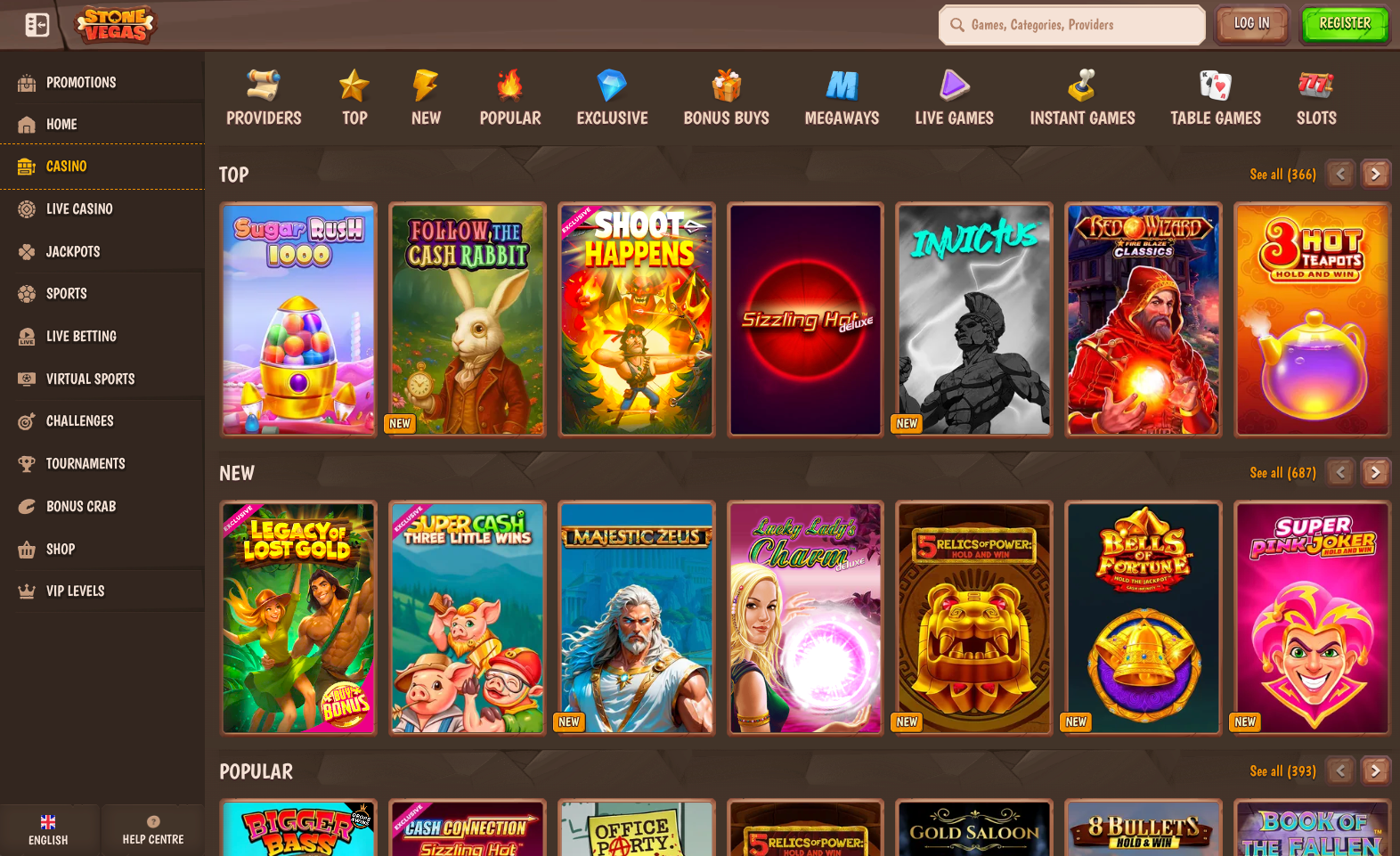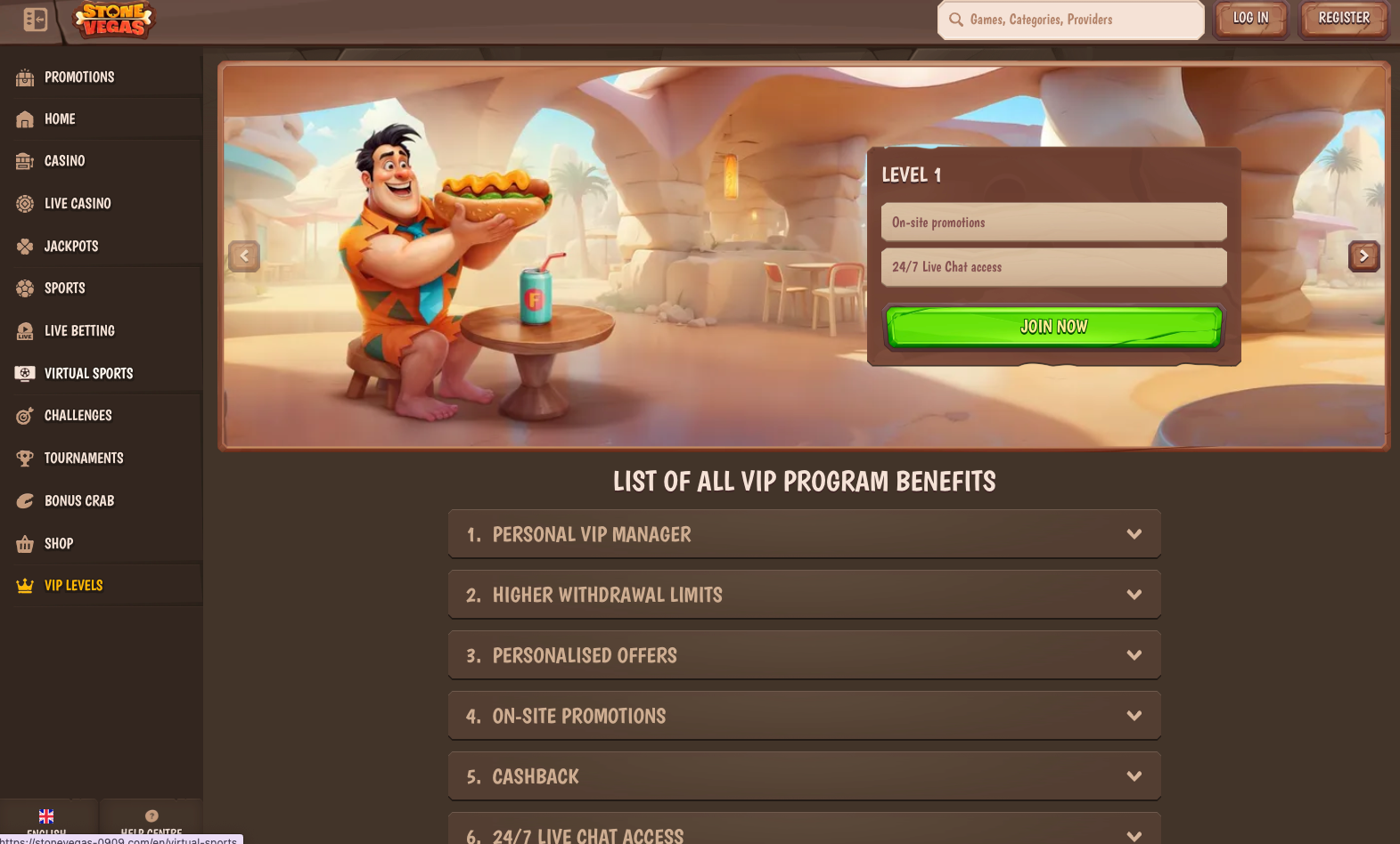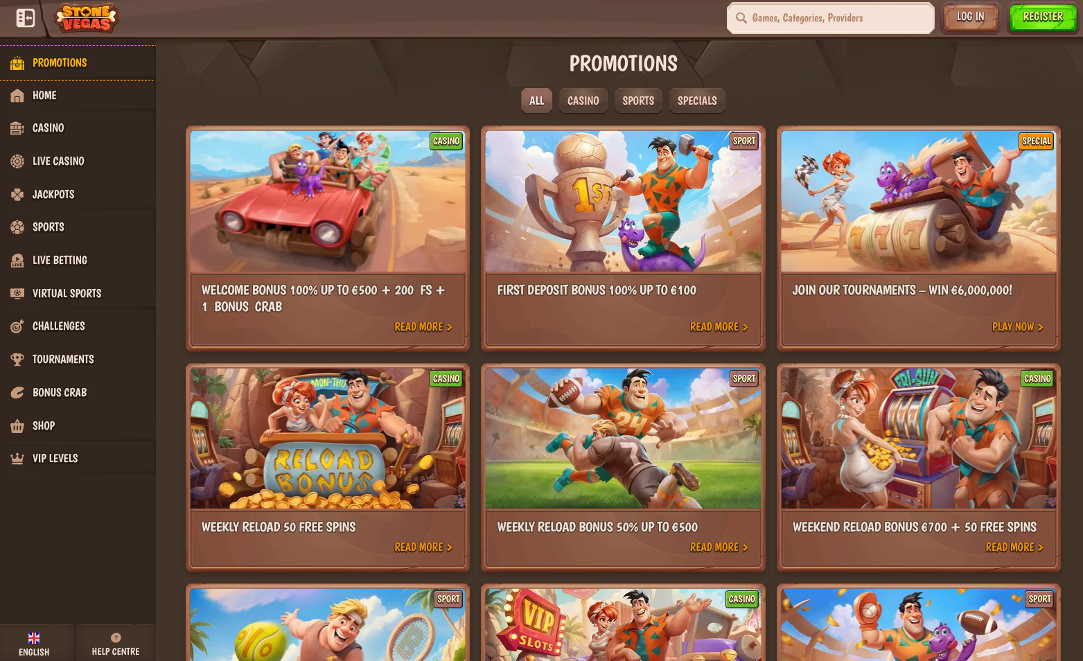 The moment players enter StoneVegas Casino, they are welcomed by a playful design inspired by a stone-age theme, blending vibrant colors with smooth navigation. The prehistoric vibe creates a fun and lighthearted atmosphere while keeping the platform professional and easy to use.