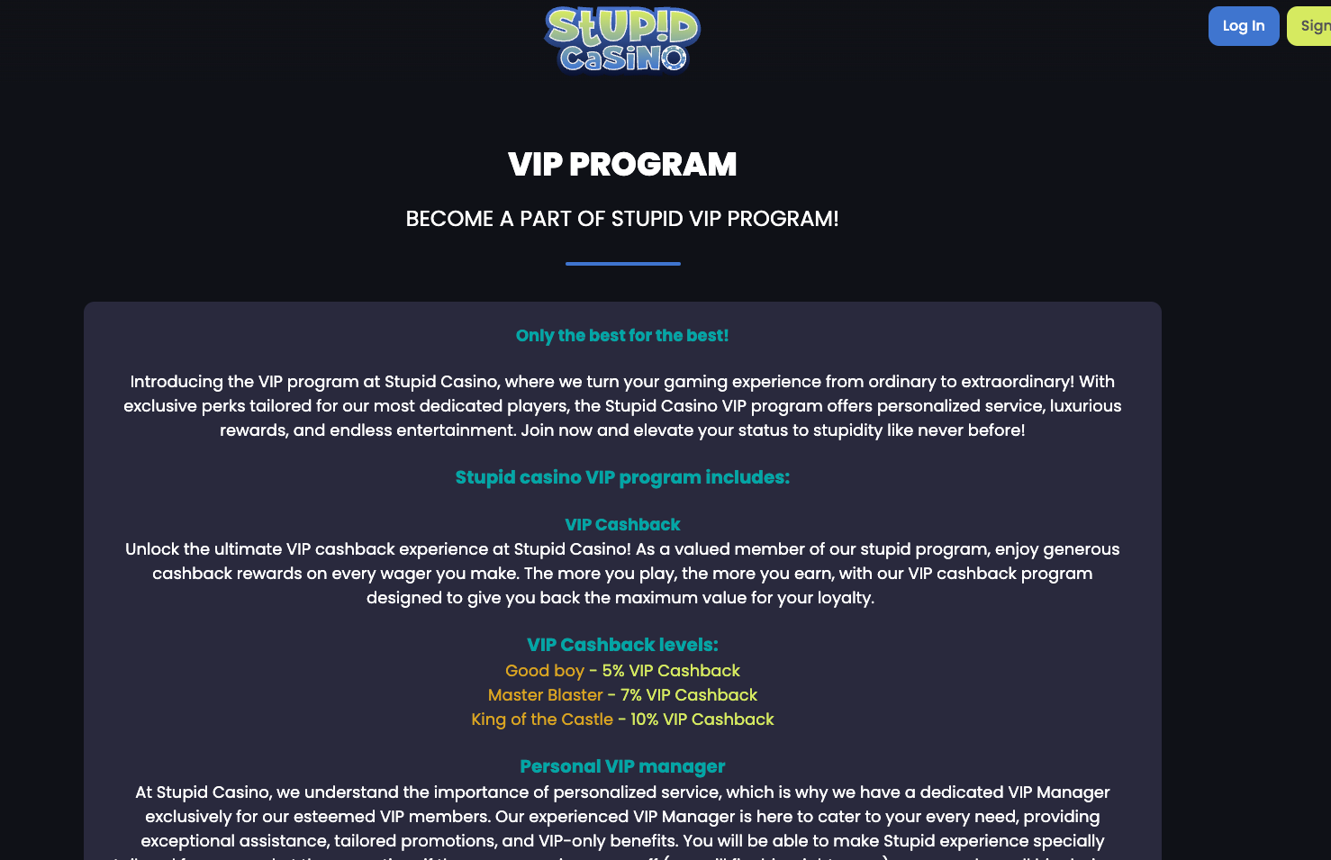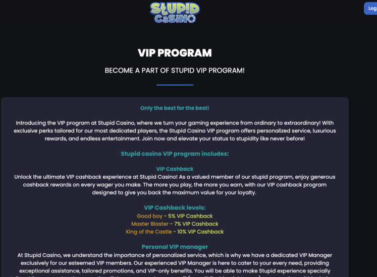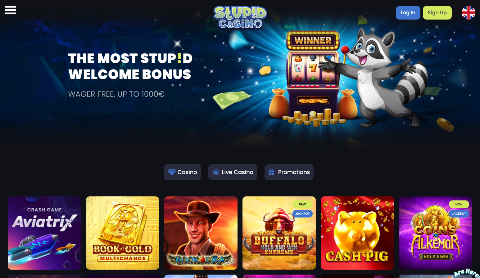 Stupid Casino offers a range of impressive features designed to elevate the gaming experience. With a sleek, user-friendly interface and a visually engaging design, the platform ensures smooth navigation for players of all levels. Its expansive game library, featuring top-tier developers, guarantees a rich and varied selection, catering to different gaming preferences. The immersive live casino section enhances the thrill by providing real-time interaction with professional dealers, replicating the excitement of a land-based casino. Stupid Casino’s commitment to modern gaming trends is evident in its acceptance of cryptocurrencies alongside traditional payment methods, ensuring seamless and secure transactions. The inclusion of a rewarding bonus system and a VIP Club provides players with additional incentives to stay engaged. Multilingual and multi-currency support further solidifies its global appeal, making it a welcoming platform for users worldwide. While the lack of a sportsbook may be a drawback for some, the overall package Stupid Casino delivers ensures a top-tier online casino experience.