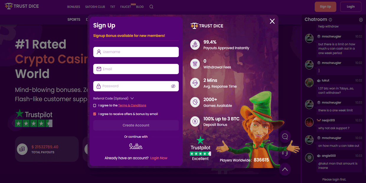 TrustDice casino is the only crypto platform with a No Deposit sign-up bonus and a 100% welcome deposit package up to 3 BTC + 25 FS.