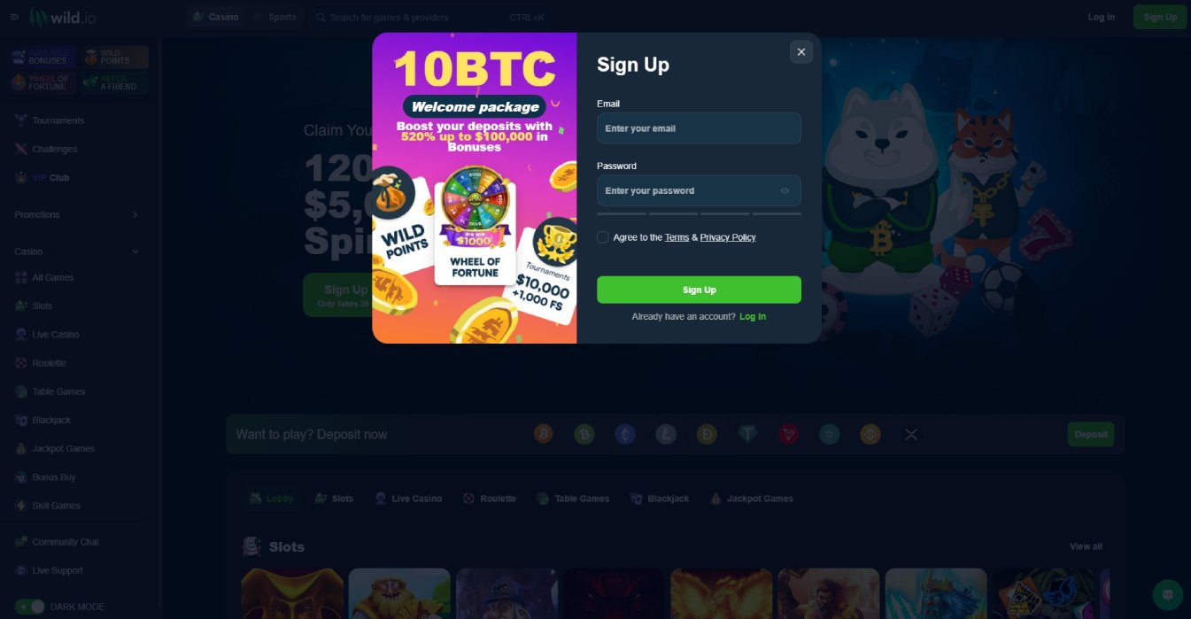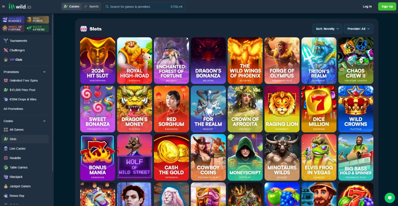Wild.io Casino offers a diverse collection of games, including slots, table games, live casino games, and a sportsbook with live betting options. The game library features thousands of titles from top-notch providers.