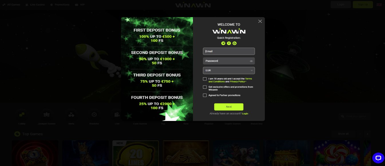 The welcome bonus at Winawin Casino includes a €3,000 bonus + 320 free spins over the first four deposits.