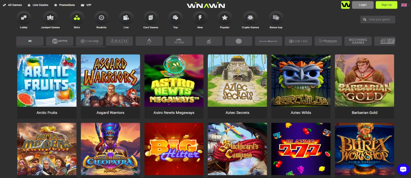 Winawin Casino offers a wide variety of games, including slots, table games, and live casino games, featuring titles like Arctic Fruits, Battle Maidens, Bonanza Billion, Aztec Magic Megaways, and Deep Sea Fortune.
