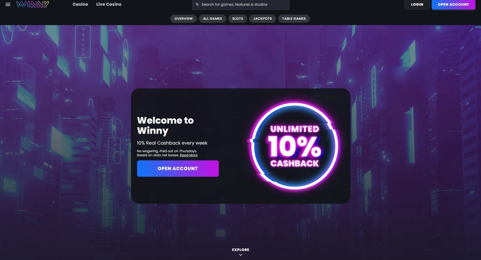 Winny Casino does not offer a traditional welcome bonus like deposit matches or free spins for new players. Instead, the platform distinguishes itself with its 10% Weekly Cashback program, which benefits all players, including newcomers, from the moment they join.