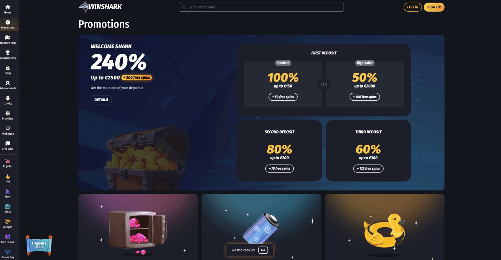 The welcome package at WinShark Casino is structured across three deposits: players can enjoy offers like 100 % up to €150 + 50 free spins, followed by 80 % + 75 spins, and 60 % + 125 spins, all with 45× wagering. High‑rollers can instead opt for a 50 % match up to €2,000 + 100 spins. Beyond the welcome series, WinShark runs recurring promotions—Weekend Reloads, Madness Day boosts, and up to 20 % cashback—plus a rewarding VIP loyalty scheme.