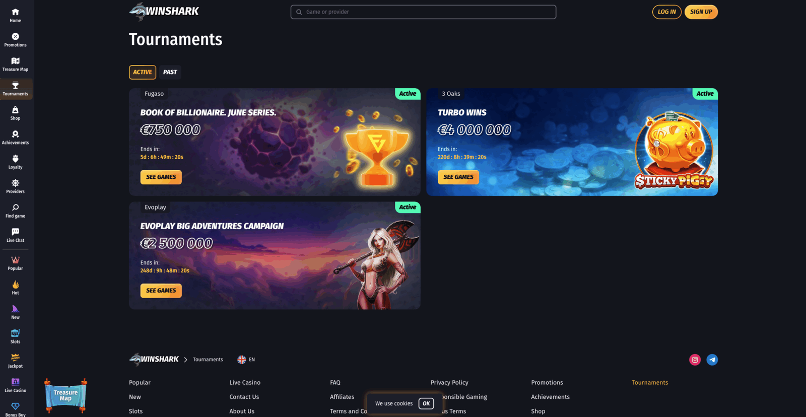 WinShark Casino takes competition to the next level with an exciting lineup of online casino tournaments, blending adrenaline-charged gameplay with significant prize pools. From Drops & Wins slots challenges (monthly prize pools around €2,000,000) to live tournament events, WinShark Casino keeps players engaged through ongoing contests.