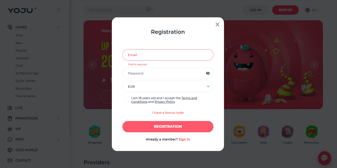 When you first register an account at Yoju Casino, you will most likely go ahead and place your first bet. When you deposit at least 10 EUR, you will be given a first deposit welcome bonus of 100% up to 250 EUR + 20 Mega Free Spins! You will be very warmly welcomed with this huge bonus offer that will give you a boosting start of your experience at this casino.
