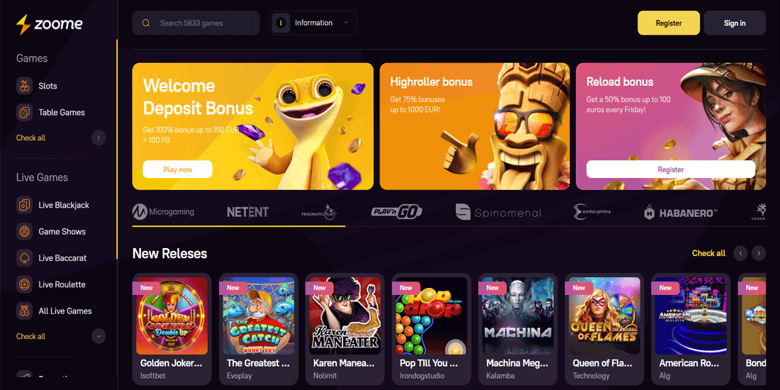 All of the titles you will discover on this casino’s catalog are produced by none other than leading software developers. Names like NetEnt, Evolution Gaming, Microgaming, Play’n GO, Quickspin, Wazdan, Yggdrasil, Playtech, and many others will make your stay at the Zoome Casino something to remember!